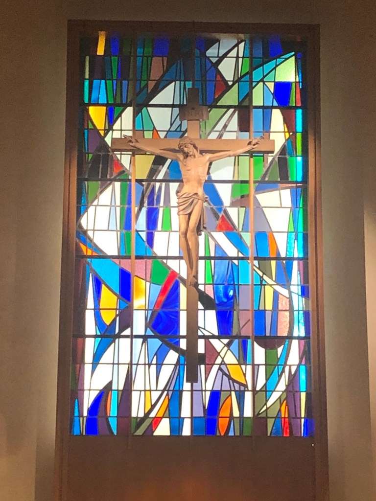 This stain glass window made from a painting done by Harry Lindstrand is thought to be the largest example of his work. It resides at St. Joseph Catholic Church in Bluffton and measures nearly 6′ x 10′. His inspiration came for this painting when he visited Europe.