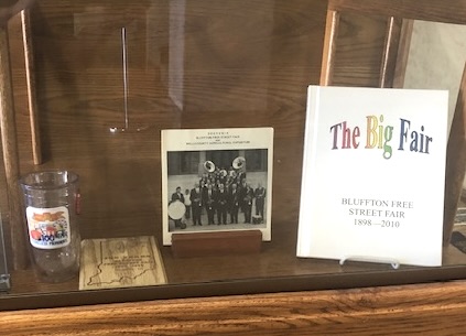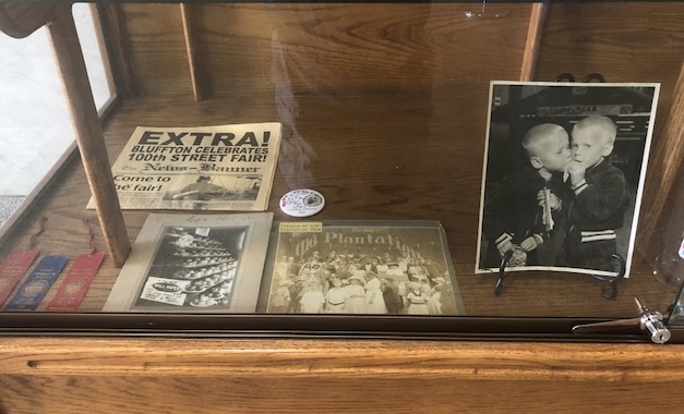 Stop by the Bluffton City Hall and check out the Bluffton Street Fair display. The fair will be held September 17 – 21, 2024. In the display, you can see some antique ribbons, fair headlines on the front page of the Bluffton News-Banner, and some unique photographs. Thank you to Wells County Museum volunteer Ben Jones for preparing the display.