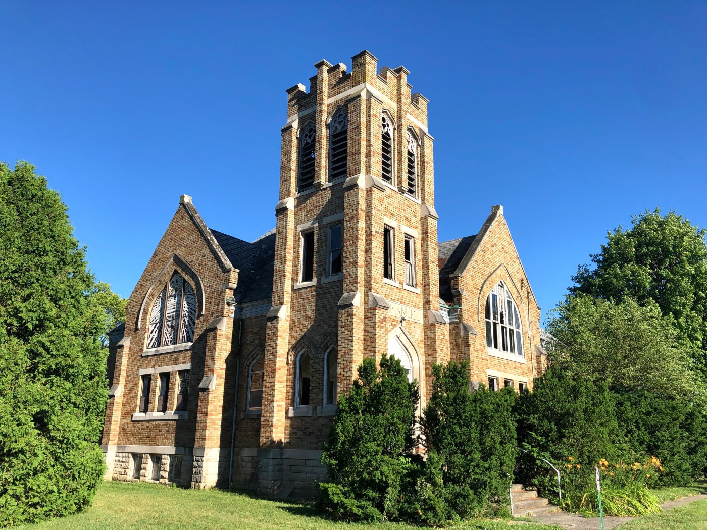Plans for the new church (shown above) were drawn, committees appointed , more pledges secured by members , a new site was donated by Mr. and Mrs. Issac W. Decker, contracts were let, ground was broken in April, 1911, the cornerstone was laid on July 2, 1911 with appropriate ceremonies, and building operation continued. The pastor secured the aid of Andrew Carnegie in the purchase of an organ.