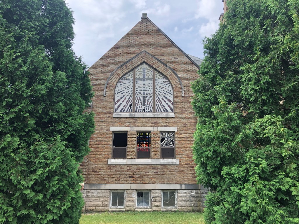 View of the front entrance of the church on the west side.