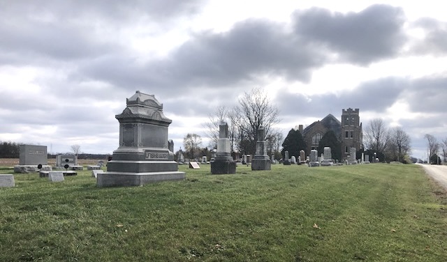 View from the north edge of the Emmanuel Cemetery also known as the Rockford Emmanuel Cemetery. The Emmanuel Church appears at the south edge of the cemetery with the road in front.