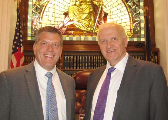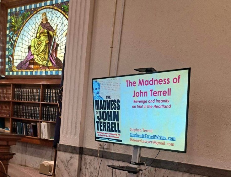 The stained glass of Lady Justice is proudly displayed above the judges bench in the Wells County Circuit Court where author, Stephen Terrell retold the story of the murder of Melvin Wolfe by John Terrell in the very same courtroom where the trial was held.