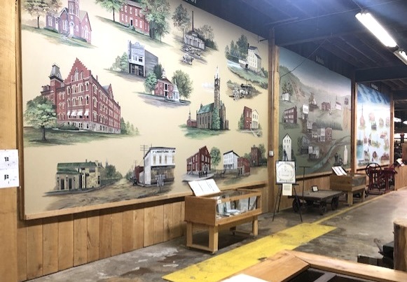 The murals show some of the early buildings and structures.